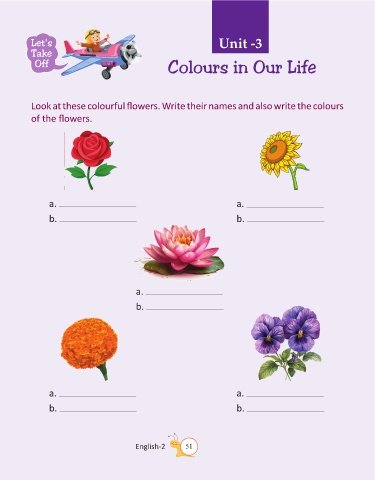 Let's Unit -3 Take Off Colours in Our Life Look at these colourful flowers. Write their names and also write the colours of the flowers. a. a. b. b. a. b. a. a. b. b. English-2 51