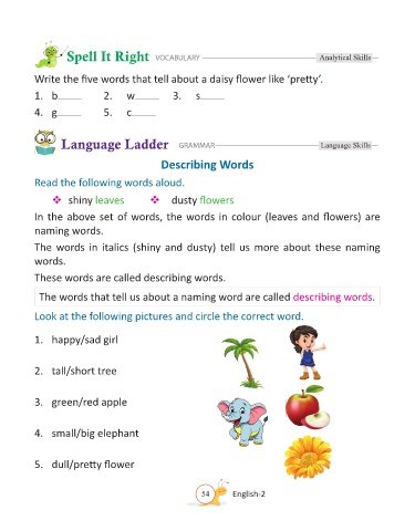Write the five words that tell about a daisy flower like ‘pretty’.