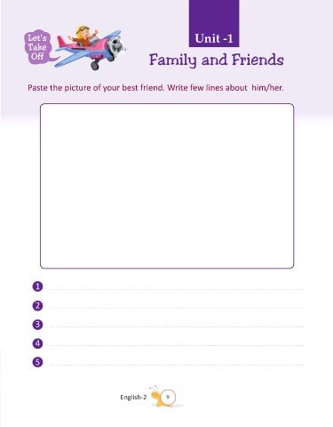 Let's Unit -1 Take Off Family and Friends Paste the picture of your best friend. Write few lines about him/her. 1 2 3 4 5 English-2 9