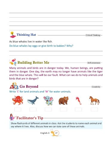 Write ‘L’ for land animals and ‘W’ for water animals.