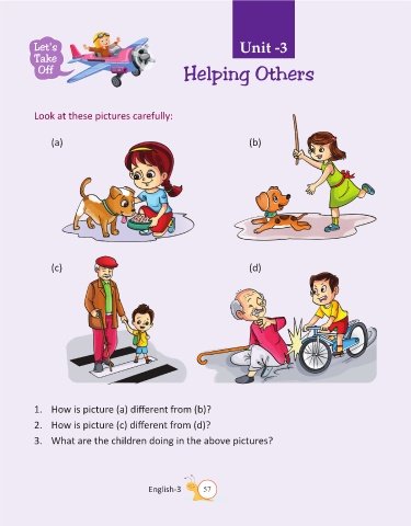 Let's Unit -3 Take Off Helping Others Look at these pictures carefully: (a) (b) (c) (d) 1. How is picture (a) different from (b)? 2. How is picture (c) different from (d)? 3. What are the children doing in the above pictures? English-3 57