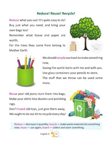 Reduce — decrease in quantity; recycle — make waste material into something