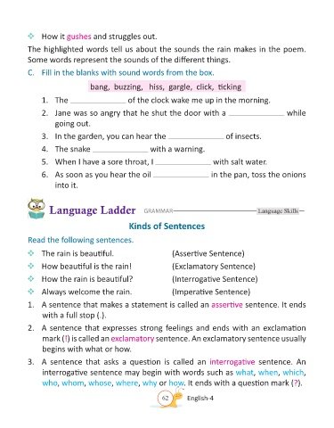 The highlighted words tell us about the sounds the rain makes in the poem.