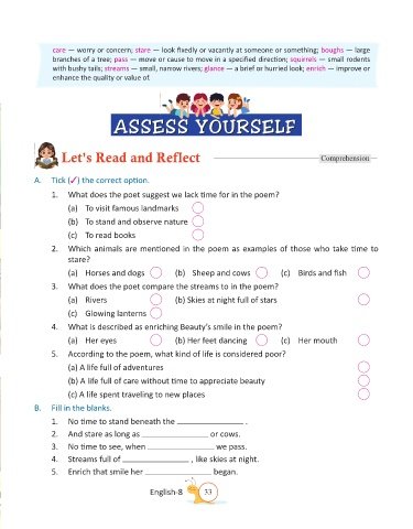with bushy tails; streams — small, narrow rivers; glance — a brief or hurried look; enrich — improve or