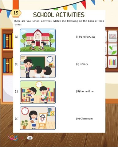 15 school activities There are four school activities. Match the following on the basis of their names (a) (i) Painting Class (b) (ii) Library (c) (iii) Home time (d) (iv) Classroom — 1 24