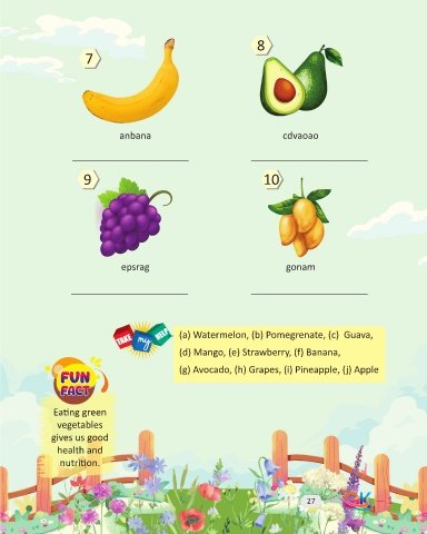 8 7 anbana cdvaoao 9 10 epsrag gonam (a) Watermelon, (b) Pomegrenate, (c) Guava, (d) Mango, (e) Strawberry, (f) Banana, (g) Avocado, (h) Grapes, (i) Pineapple, (j) Apple Eating green vegetables gives us good health and nutrition. 27 — 1