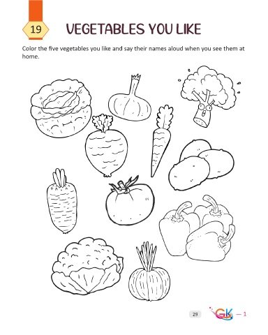 19 vegetables you like Color the five vegetables you like and say their names aloud when you see them at home. 29 — 1