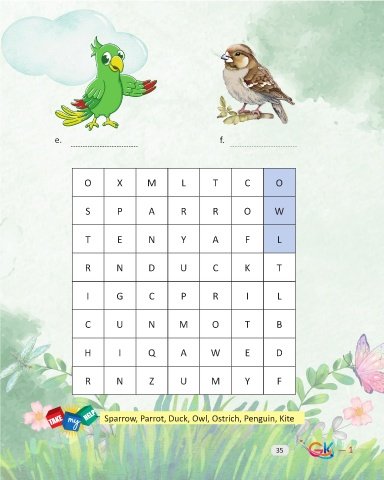 e. f. O X M L T C O S P A R R O W T E N Y A F L R N D U C K T I G C P R I L C U N M O T B H I Q A W E D R N Z U M Y F Sparrow, Parrot, Duck, Owl, Ostrich, Penguin, Kite 35 — 1