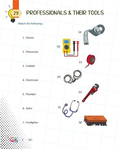29 Professionals & Their Tools Match the following : (a) 1. Doctor (b) 2. Policeman (c) 3. Cobbler (d) 4. Electrician (e) 5. Plumber 6. Tailor (f) 7. Firefighter (g) — 1 44