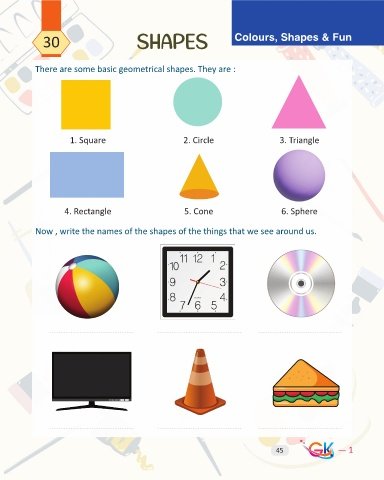 30 Shapes Colours, Shapes & Fun There are some basic geometrical shapes. They are : 1. Square 2. Circle 3. Triangle 4. Rectangle 5. Cone 6. Sphere Now , write the names of the shapes of the things that we see around us. 45 — 1