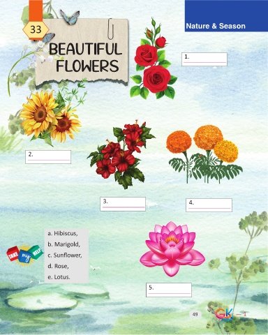 33 Nature & Season Beautiful 1. Flowers 2. 3. 4. a. Hibiscus, b. Marigold, c. Sunflower, d. Rose, e. Lotus. 5. 49 — 1