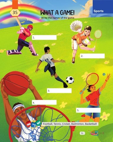 35 What a Game! Sports Write the names of the game. 1. 2. 3. 4. 5. Football, Tennis, Cricket, Badminton, Basketball 51 — 1