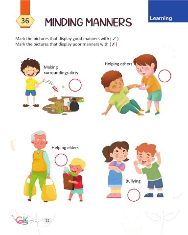 36 minding manners Learning Mark the pictures that display good manners with ( 3 ) Mark the pictures that display poor manners with ( 7 ) Helping others Making surroundings dirty Helping elders Bullying — 1 52