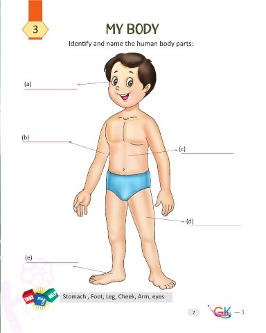 3 MY BODY Identify and name the human body parts: (a) (b) (c) (d) (e) Stomach , Foot, Leg, Cheek, Arm, eyes 7 — 1