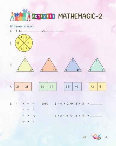 Mathemagic-2 Fill the next in series. 1. 4 , 8 , , , 20 , , 4 2 2. 12 3 8 ? 3 4 5 ? 3. 5 8 7 10 9 12 ? ? 4. 24 28 30 34 36 40 42 ? 5. If + = – then, 3 – 4 × 2 2 + 3 = – = * * = 6 × 3 – 4 2 + 4 = = + 23 — 3