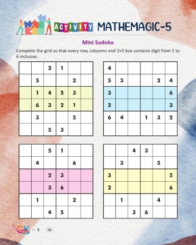 Mathemagic-5 Mini Sudoku Complete the grid so that every row, coloumn and 2×3 box contains digit from 1 to 6 inclusive. 2 1 4 5 2 5 3 2 4 1 4 5 3 3 6 6 3 2 1 2 3 3 5 6 4 1 3 2 5 3 5 1 4 3 4 6 3 5 2 3 3 5 3 6 2 6 1 2 1 4 4 5 3 6 — 3 58