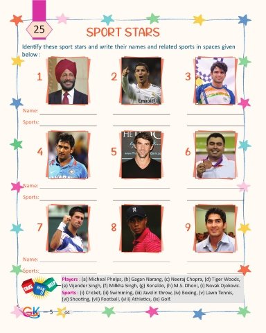 Sports : (i) Cricket, (ii) Swimming, (iii) Javelin throw, (iv) Boxing, (v) Lawn Tennis,