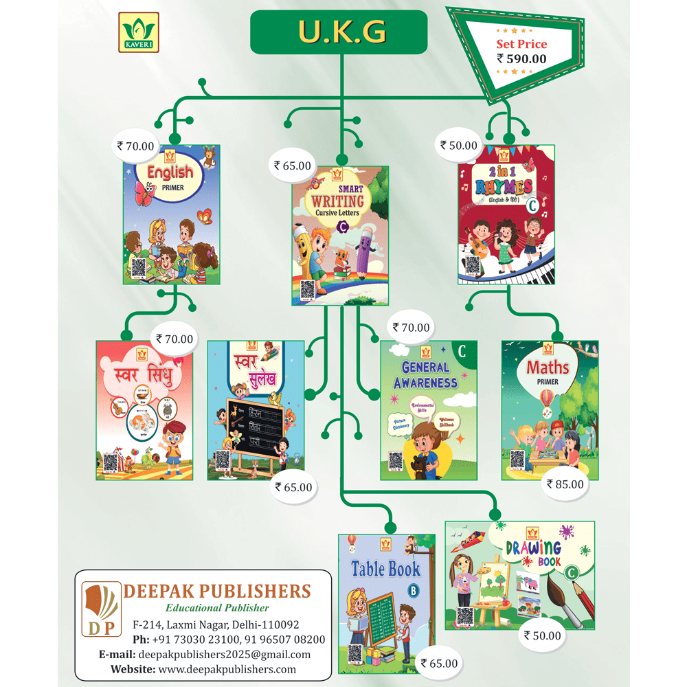 The Kaveri U.K.G Book Set by Deepak Publishers is designed to prepare children for primary school with clear concepts, colourful pages and engaging activities. Each book introduces slightly advanced learning while still keeping it fun, creative and easy to understand for young learners.